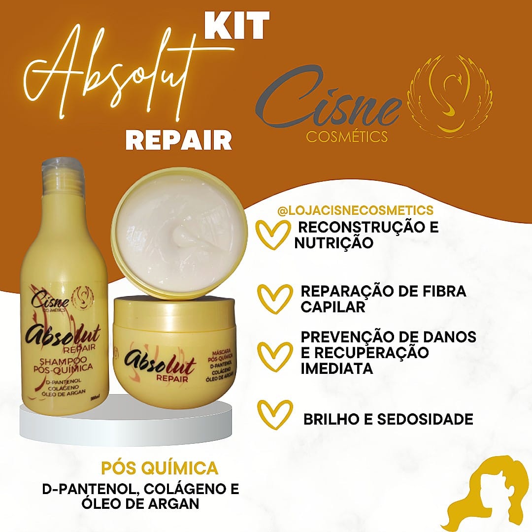 A linha Absolut Repair da Cisne é enriquecida com D-Pantenol, Colágeno e Óleo de Argan que promovem condicionamento, emoliência e nutrição aos fios. O Shampoo Pós-Química reconstrói os cabelos danificados para restaurar a umidade, a elasticidade e o brilho, limpando delicadamente os cabelos. A Máscara Pós-Química é uma máscara capilar que promove intensa hidratação aos cabelos, deixando-os macios, sedosos e com brilho.